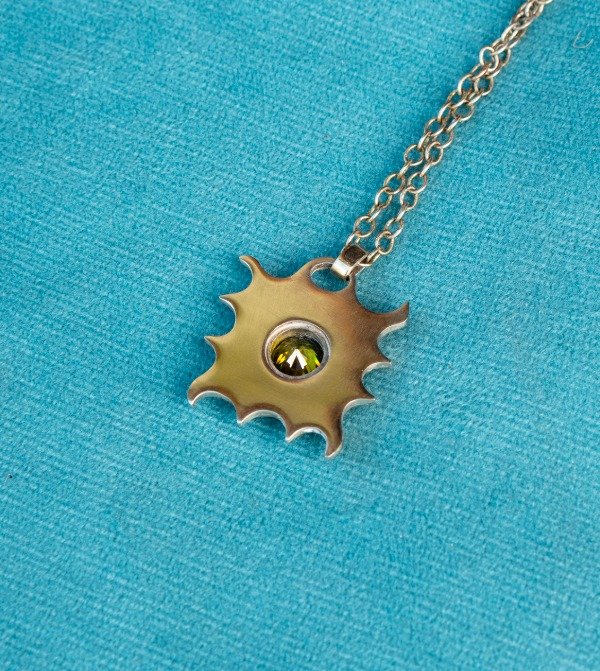 Pieza única, realizada en alpaca, resina y cubic verde oliva.